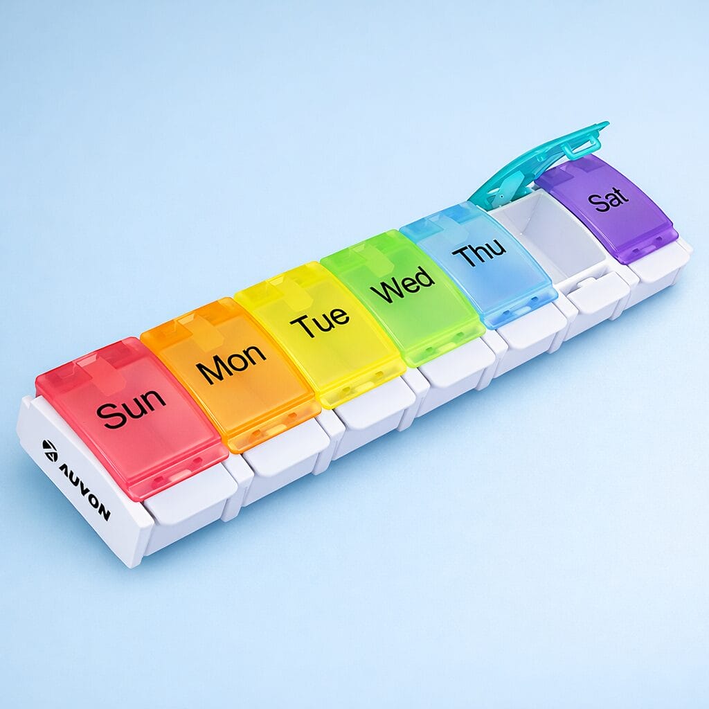 Clear labeling—large print, high contrast, and logical layout—helps prevent missed or double doses. Transparent lids can also make it easy for caregivers or family members to check at a glance whether pills have been taken.