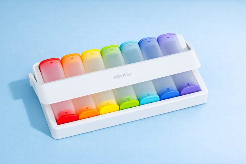 The Koviuu takes a different approach from traditional flat pill boxes by using seven individual daily pods instead of one tray with multiple lids. That makes it especially appealing for people who want to grab just one day’s medication and head out without carrying an entire organizer.