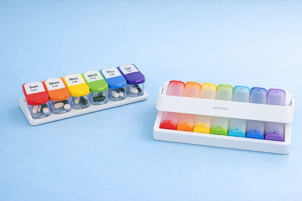Compared to larger multi-compartment organizers like the Auvon or Bexeen, the Koviuu is less about managing complex schedules and more about portability and convenience. It’s not the fastest to fill, but if your priority is easy-to-open lids and true grab-and-go daily doses, it’s a very practical option.